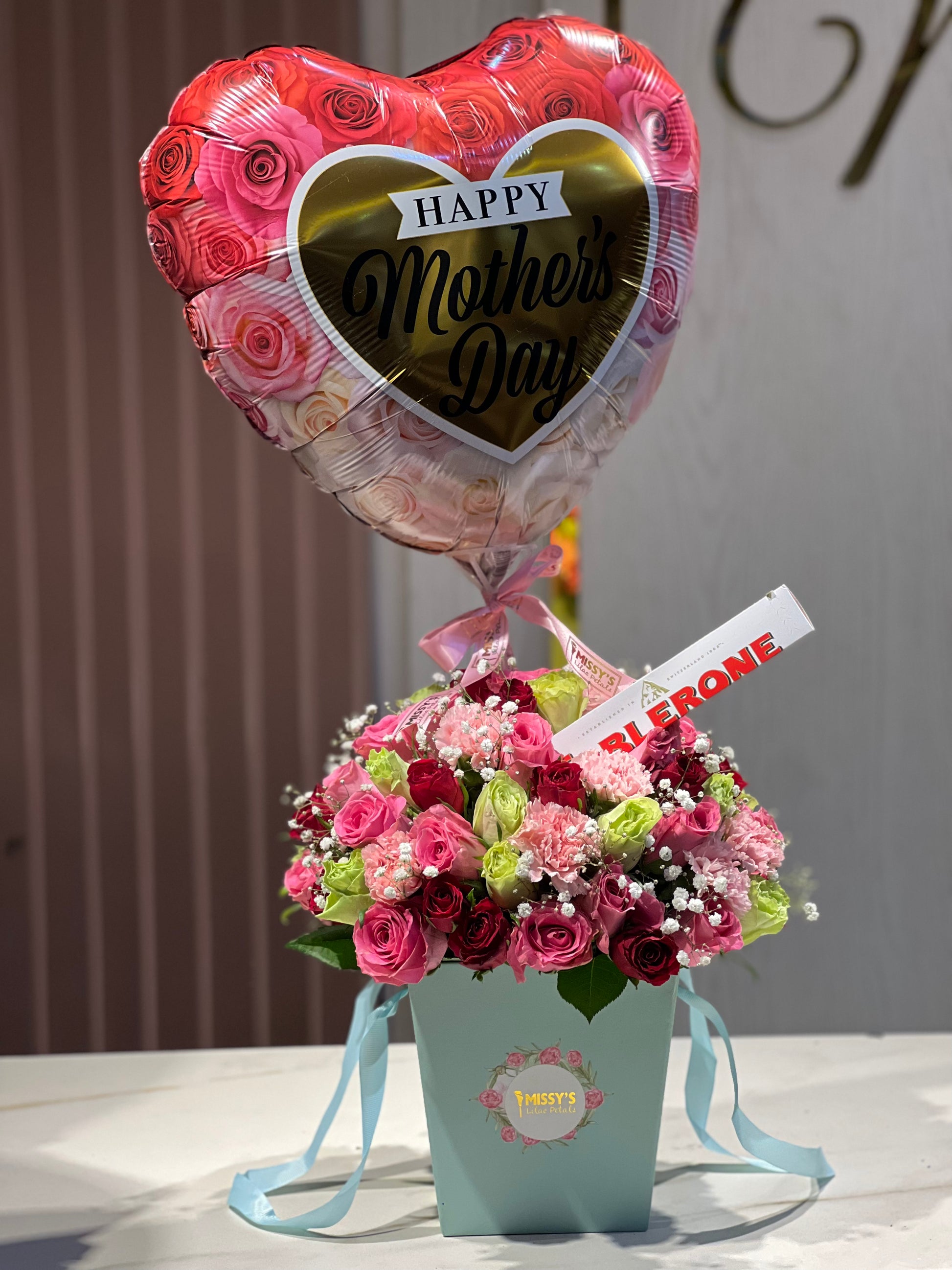 Flowers, chocolate and balloon