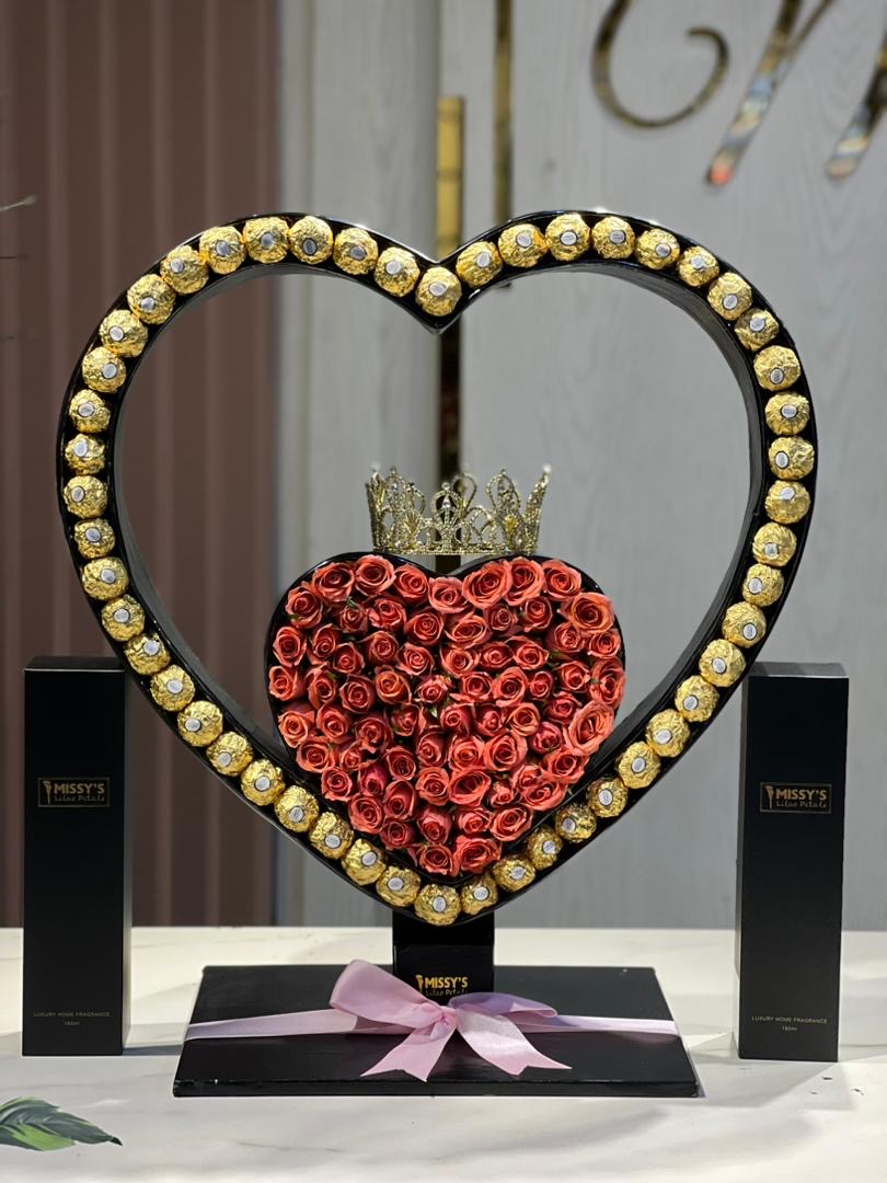 Package for a Queen with chocolates , pink roses , crown and two home fragrances.