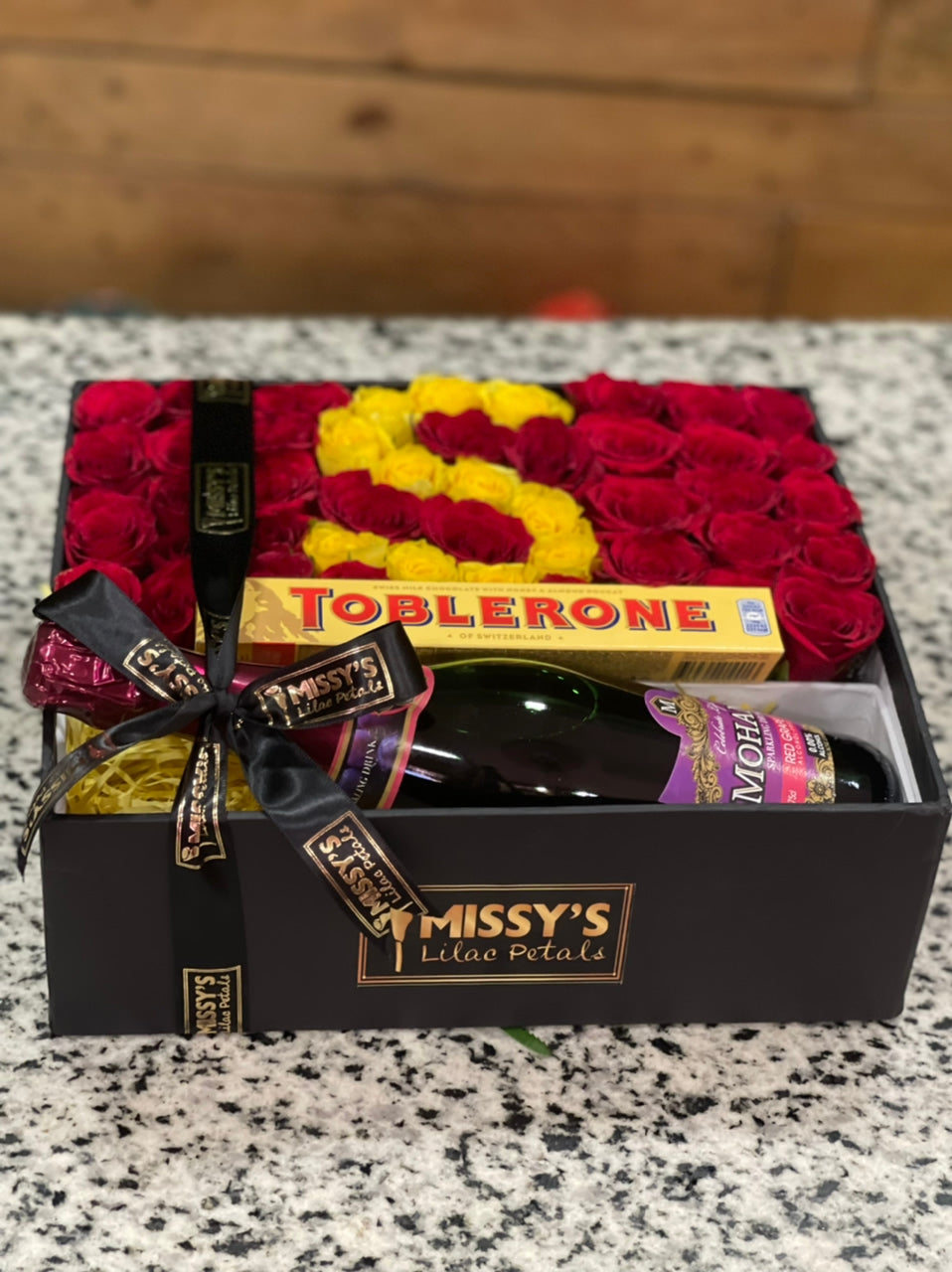 Non alcoholic drink, chocolate and flowers.